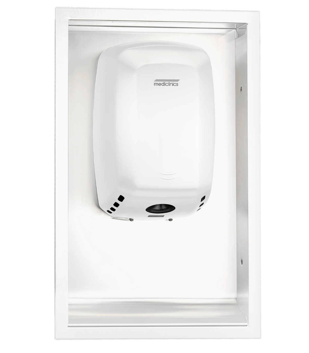• 壁箱由两个焊接部件制成。烘干机安装区域由钢制成,白色表面,厚度 1 毫米。它包括 4 个焊接在底板顶部的 M5 螺栓,用于安装 Machflow 干手器。框架由 0.7 毫米 18-8 型 AISI304 不锈钢制成,带有 4 个 Ø6.5 毫米的螺丝孔,用于安装在墙上。