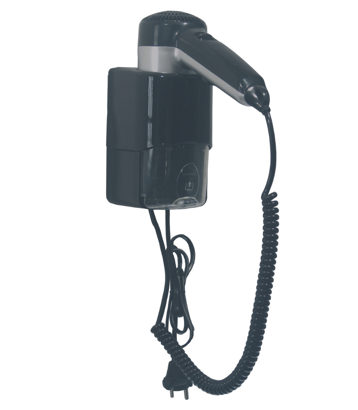酒店浴室壁挂式吹风机,由黑色 ABS 制成,配有两个剃须刀插座