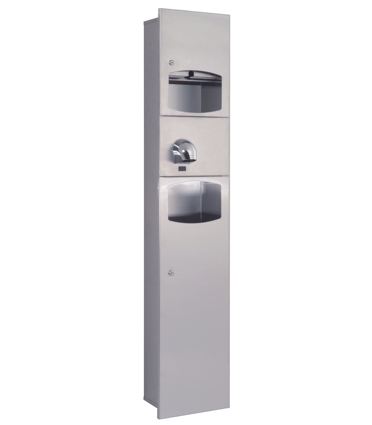 嵌入式多功能柜,包含 Saniflow 干手器、纸巾分配器和废物容器,由 AISI 304 不锈钢制成,表面光滑。
