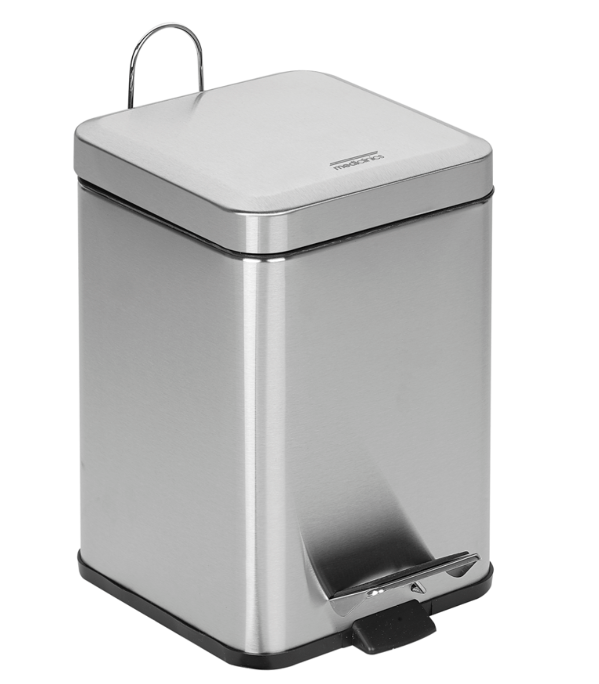 • 免提脚踏式方形垃圾箱,带自动关闭盖,容量为 6 升,可独立站立,由 AISI 410 不锈钢制成,缎面处理。