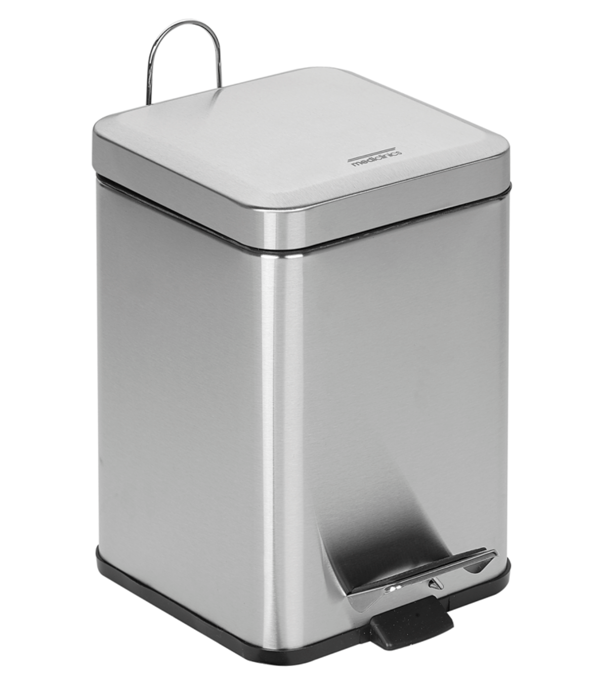 • 免提脚踏式方形垃圾箱,带自动关闭盖,容量为 12 升,可独立站立,由 AISI 410 不锈钢制成,缎面处理。