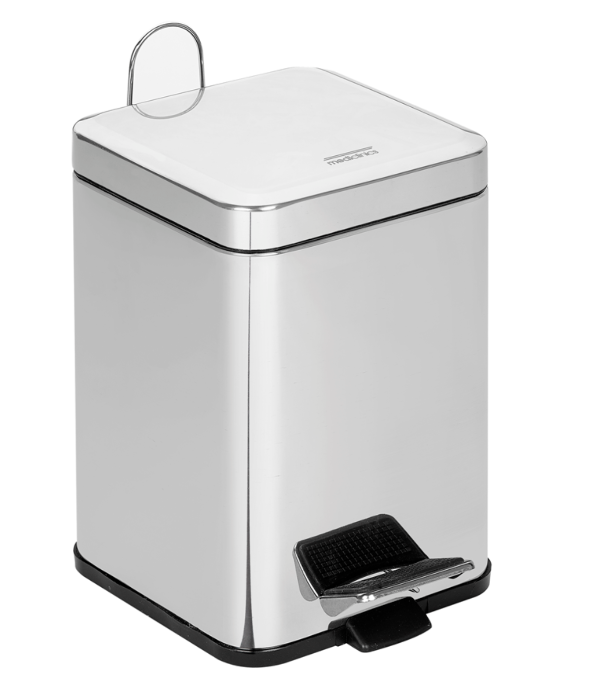 • 免提脚踏式方形垃圾箱,带自动关闭盖,容量为 12 升,可独立站立,由 AISI 410 不锈钢制成,表面光亮。