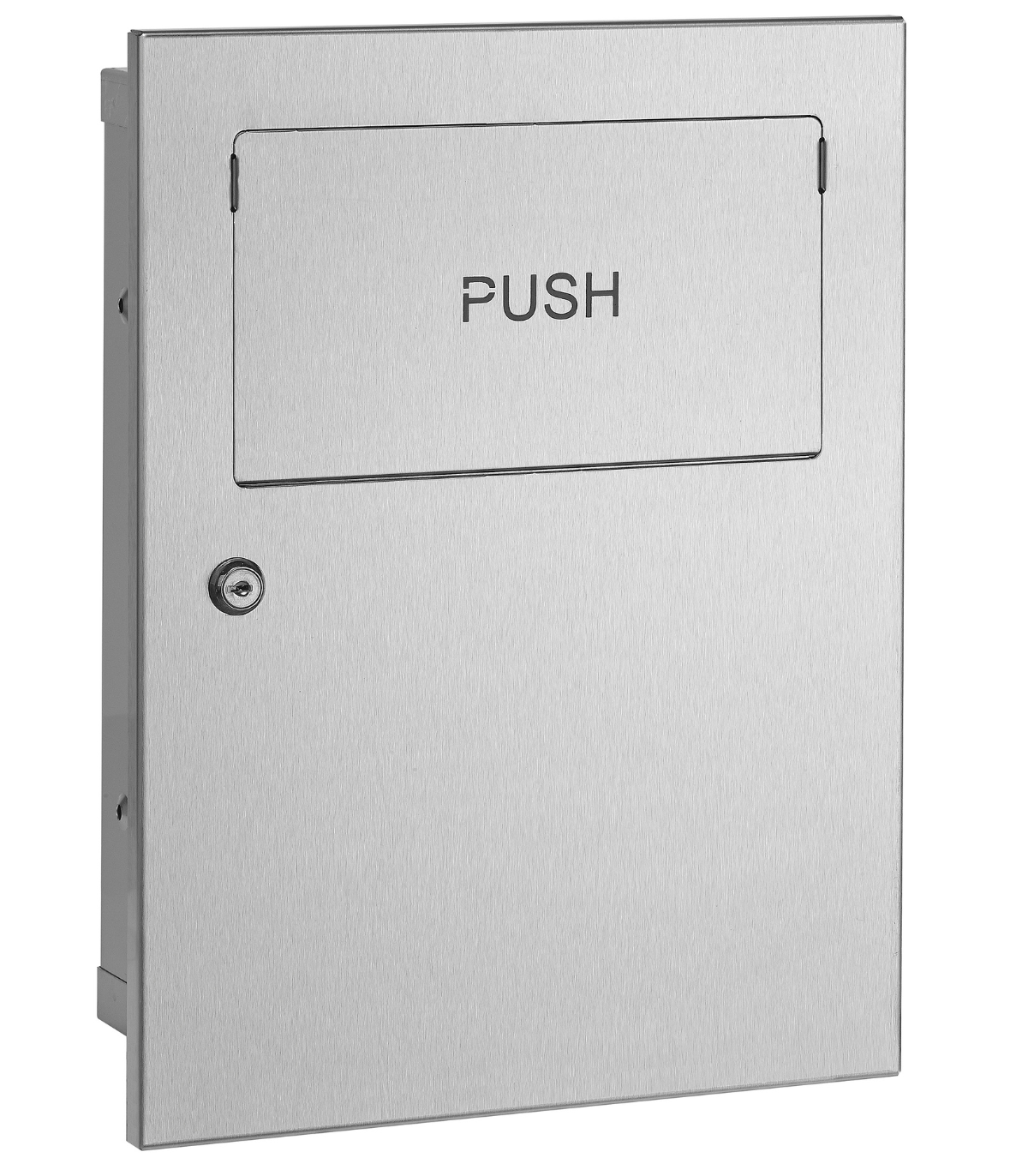 • 带自动返回盖的垃圾箱可直接嵌入墙壁,容量为 5.4 升,完全由 AISI 304 不锈钢制成,所有可见部件均经过缎面处理。完全焊接,边角坚固,无毛刺和尖锐区域。