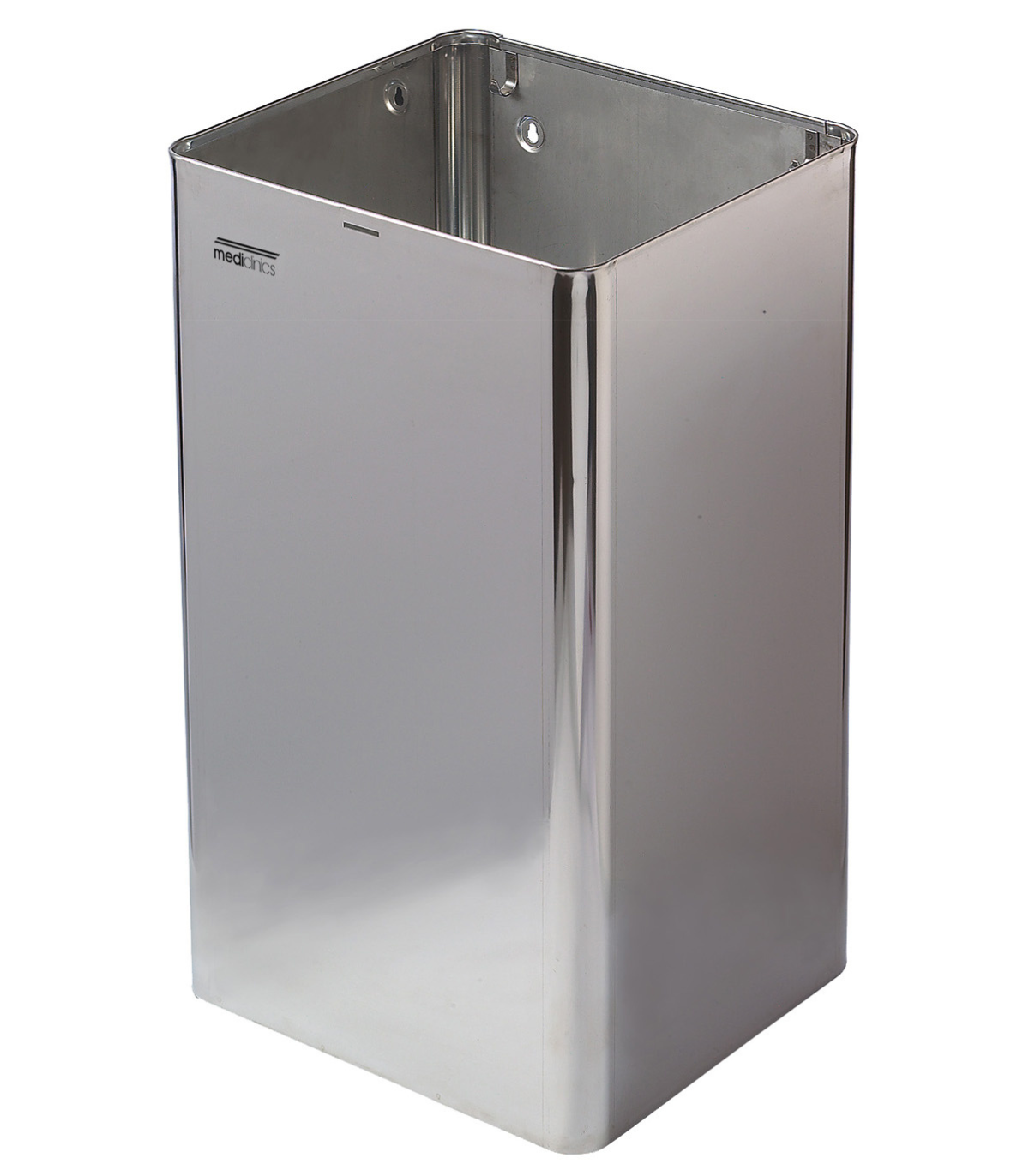 • 无盖废物容器,容量65L,一件式制造,完全密封。通过设备背面钻的 2 个槽孔安装在地板或墙上。