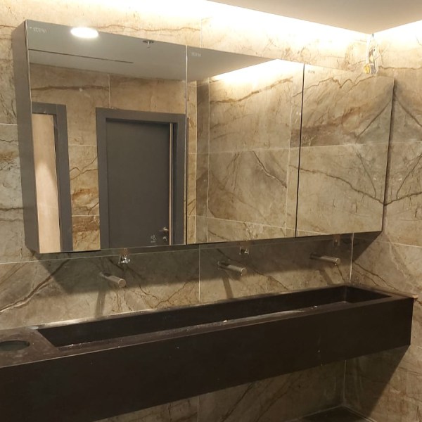 带可锁镜子的完整卫生柜。包括高速干手器、免触式皂液器和 LED 图标,以直观地指导用户。配有遥控器,可调整皂液剂量、LED 颜色和其他自定义设置。