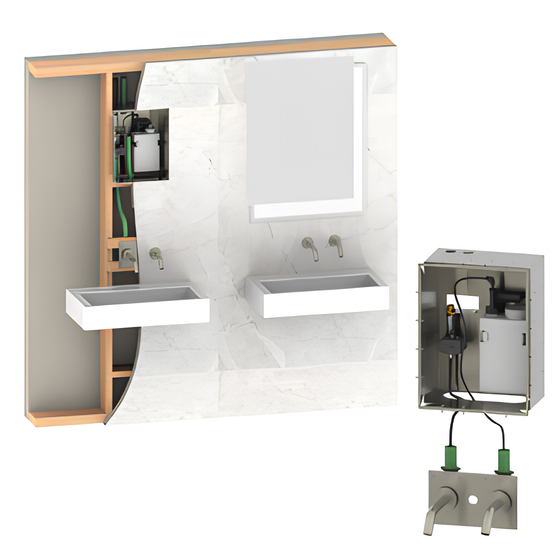 非接触式皂液器和水龙头,可嵌入式安装在镜子或面板后面。嵌入式安装双 Extreme CS AISI316嵌入式安装双 D28 DP AISI316探索嵌入式安装组合:专为商业卫生间设计的免触摸壁挂式电子水龙头和皂液器组合。它具有 IP67 双电源输入、备用锂电池和可通过遥控器调节的设置,可提高卫生和清洁度。其不锈钢 AISI316 机身确保耐用性和防破坏性。它非常适合公共交通卫生间等紧凑空间,可节约用水并防止交叉污染。易于安装且设计优雅,使其成为具有挑战性的安装的持久选择。