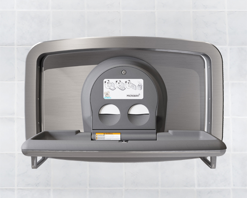 嵌入式水平婴儿换尿布台,采用一体式、深冲、均匀纹理的不锈钢外观。这种结构消除了接缝、锋利边缘和焊接线,形成了一种现代美感,有助于提升任何洗手间的外观。还有黑色哑光饰面可供选择(KB310-SSRE-MBLK)。产品的主要特点包括符合 ADA 和 ASTM 标准、激光蚀刻徽标以及易于装载和使用的双腔分配器,用于卫生床垫和尿布袋。KB310 配有壁挂式不锈钢袋钩,可更轻松、更安全地取用尿布袋。聚丙烯床面含有独有的 Microban® 抗菌产品保护,可减少清洁期间产生异味的细菌。