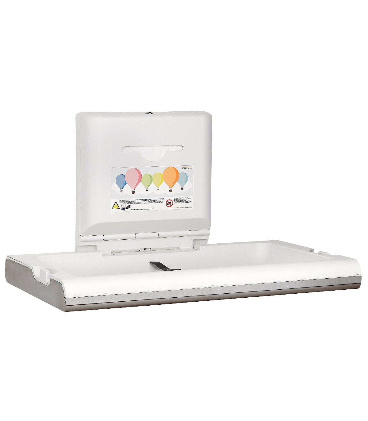 • 水平表面安装婴儿换尿布台由抗菌聚丙烯制成,外部采用 AISI 304 不锈钢。