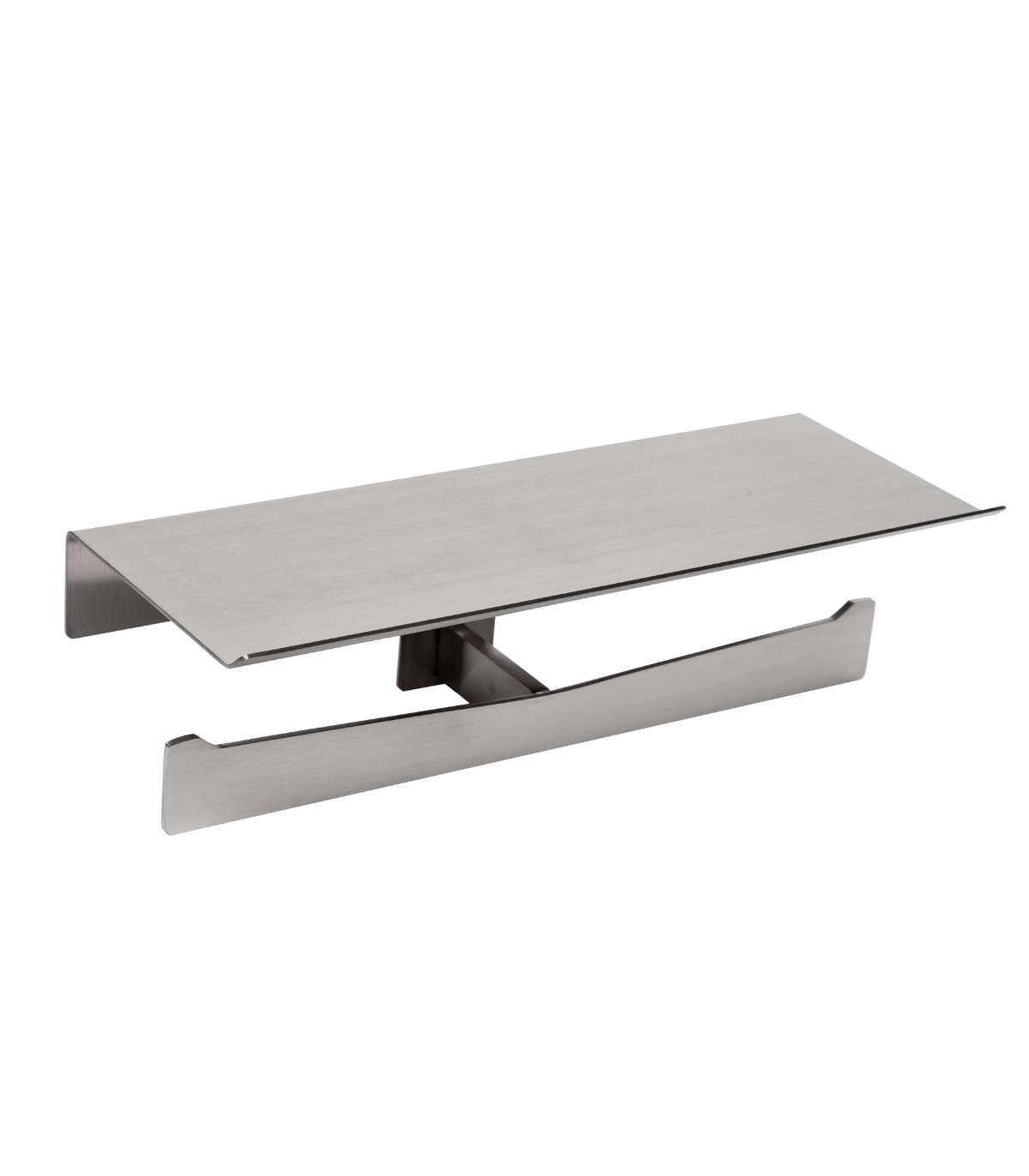 • 双厕纸架,带架子,可放置手机或其他小物品,采用 AISI 304 不锈钢制成,来自 Mediclinics 的 Aura 系列。