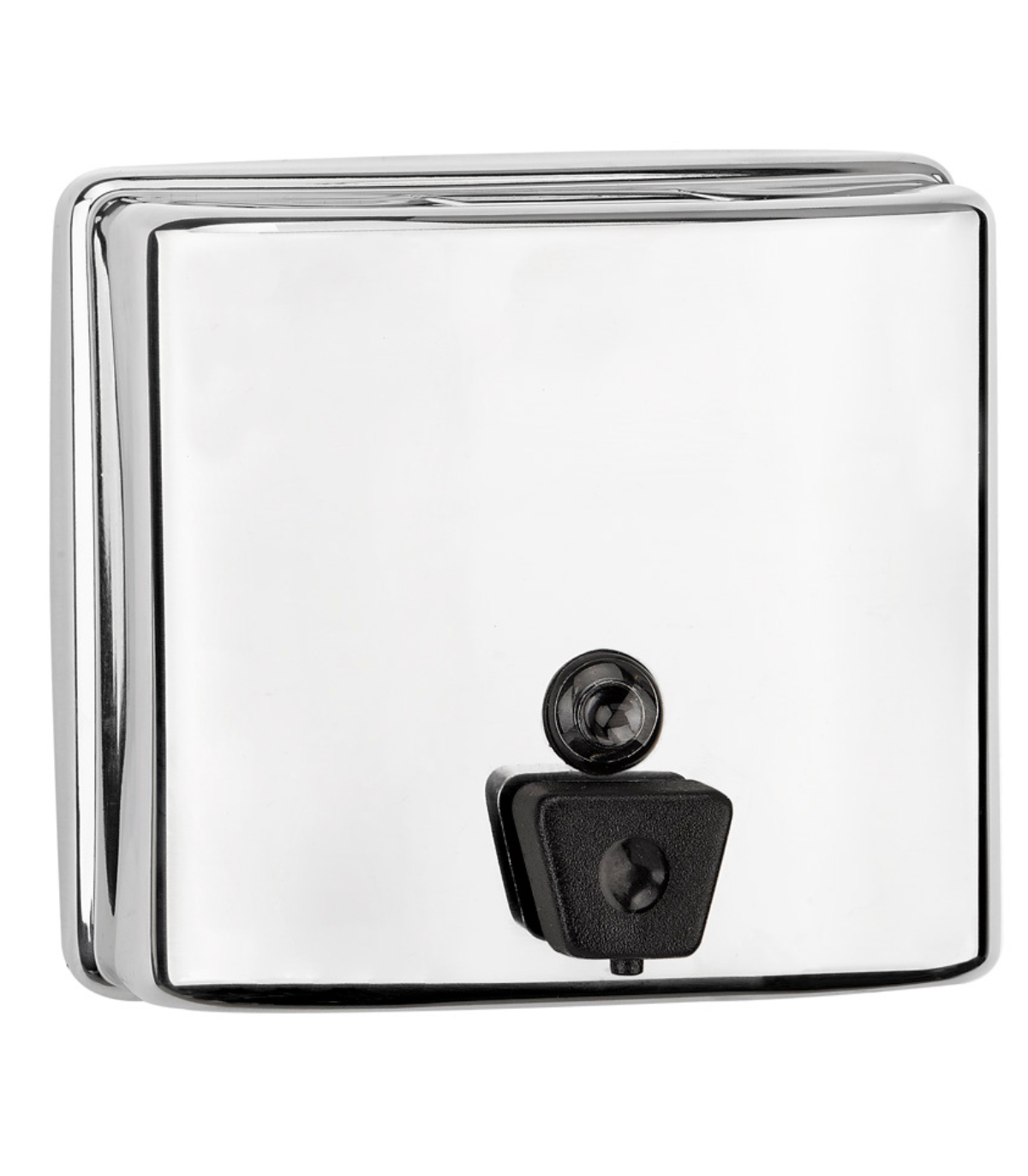 • 按钮式壁挂式液体皂液器,容量为1.3 升,采用不锈钢AISI 304 制造,厚度为1.0 毫米。