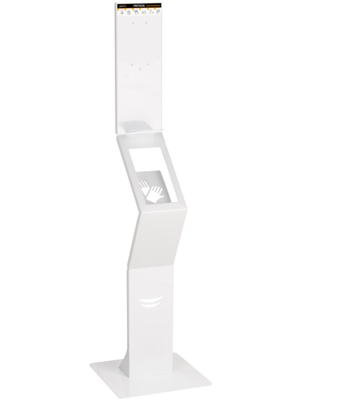 • 用于 Mediclinics 洗手液分配器的可移动且坚固的洗手台支架,由钢制成,涂有白色环氧树脂,并具有沉重且稳定的方形底座。