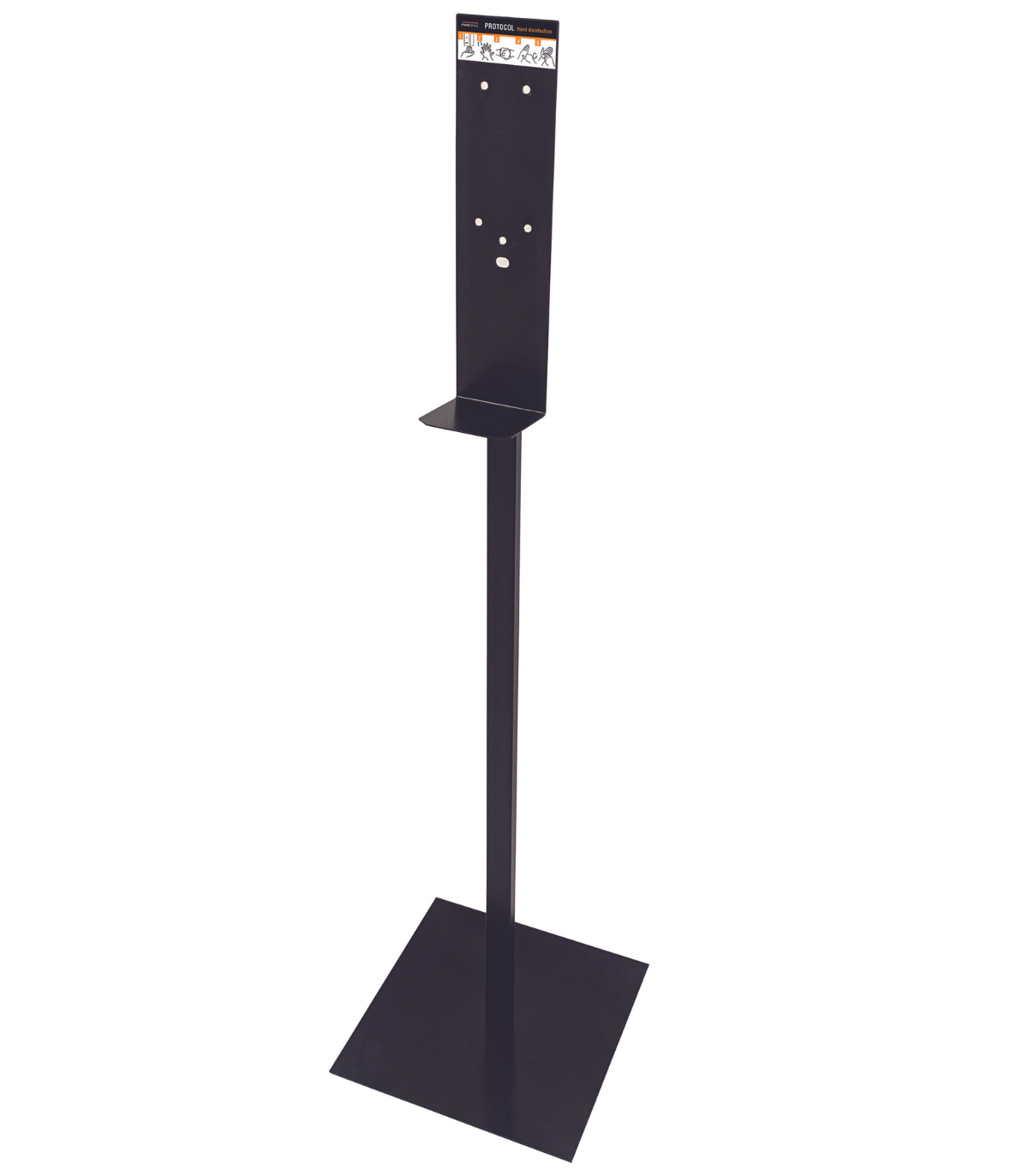 • 坚固且可移动的洗手台支架,用于 Mediclinics 洗手液分配器,由钢制成,涂有哑光黑色环氧树脂,并具有沉重且稳定的方形底座。
