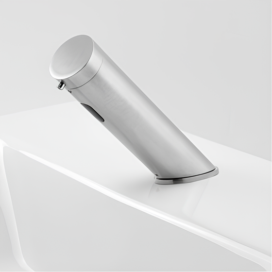 Stern 的免触式皂液器可自动关闭且不会滴水,有助于确保浴室保持井然有序和整洁。结合 Green 免触式电子水龙头,可创造无菌自动化环境。