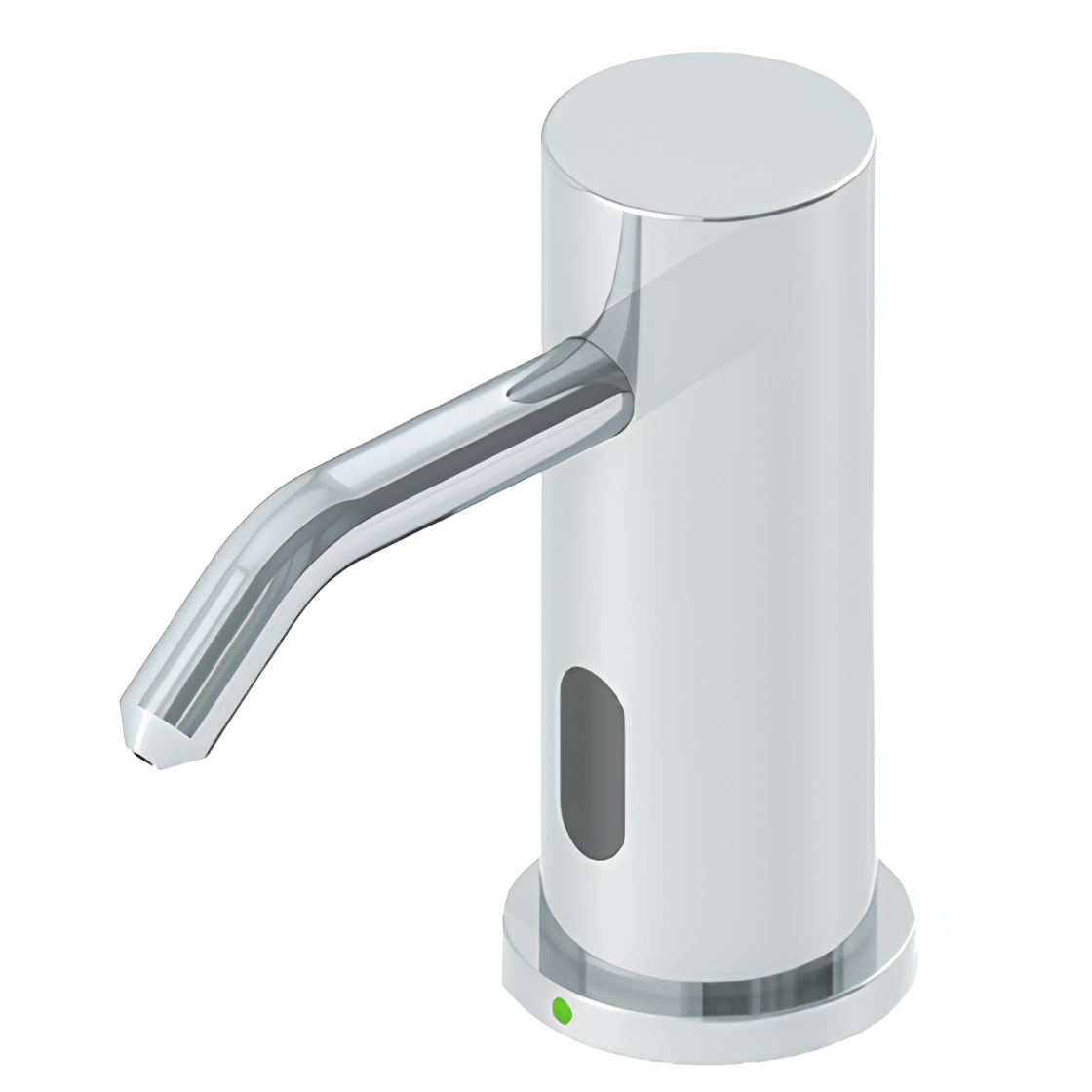 询问有关此产品的信息免触式电子皂液器,适用于台面安装,皂液器内装有皂液量指示器。由红外传感器激活。适用于任何非专利皂液,粘度建议。镀铬机身,其他表面处理可选。包括一个 6 升皂液罐,适用于人流量大的区域。配有专用蠕动泵,可防止堵塞和回流。可通过遥控器调整设置:皂液量、皂液罐补充、暂时关闭和恢复出厂设置。
