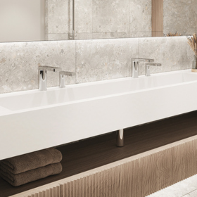 “免触摸”甲板安装自动皂液器。配套的免触式水龙头具有配套的表面处理。剂量和传感器范围可通过遥控器调整。防止回流和堵塞的蠕动泵。使用 Stern 遥控器可以执行以下功能:选择肥皂数量、重新填充肥皂箱、暂时关闭、恢复出厂设置。